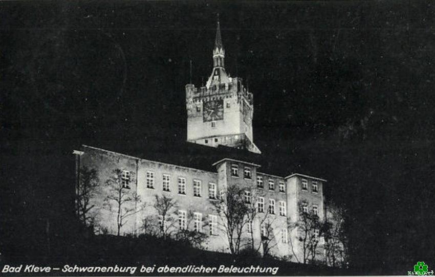 Die alte Schwanenburg am Abend Einen tollen Anblick bot die Schwanenburg schon immer. Hier sehen wir sie schön beleuchtet mit der damals noch aktuellen schwarzen Turmuhr.