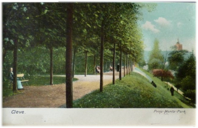 Um die Jahrhundertwende war der Moritz-Park einer von zahlreichen „Hot-Spots“ in Kleve. Wie man sieht, ist jede Sitzbank besetzt, denn die Aussicht war damals noch freier als es heute der Fall ist. Der Hang zum Kermisdahl war noch nicht von Sträuchern überwuchert und man konnte sogar darauf entlang spazieren.