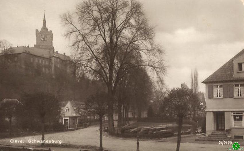 Wie man an den Bäumen sehen kann, haben wir auf diesem Bild wohl Winter. Die Boote liegen umgedreht auf der Wiese. Rechts ist ein Teil des Hotels Scho zu erkennen. Die Uhr an der Schwanenburg hatte noch ihr schwarzes Zifferblatt.