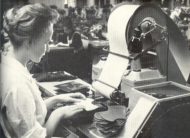 Es handelte sich um einen Apparat, auf dem kunstgerecht die Lochverzierungen ausgestanzt wurden. Wir sehen hier eine Mitarbeiterin bei der Bedienung dieser interessanten Maschine.