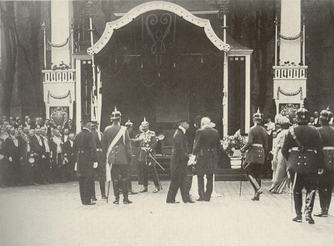 Als der Deutsche Kaiser Wilhelm II. mit Kaiserin Auguste Victoria und einem riesigen Gefolge am 09. August 1909 die Stadt Kleve besuchte, hatte man für diesen einen Tag neben zahlreichen Aktionen und Aktivitäten auch eine Ehrenloge vor der Stiftskirche errichtet. Es wurde die 300-jährige Zugehörigkeit des Herzogtums Kleve zu Brandenburg-Preußen gefeiert und dafür wurde an diesem Tag in Anwesenheit der größten deutschen Würdenträger das „Hohenzollerndenkmal“ mit dem Reiterstandbild des „Großen Kurfürsten“ enthüllt.