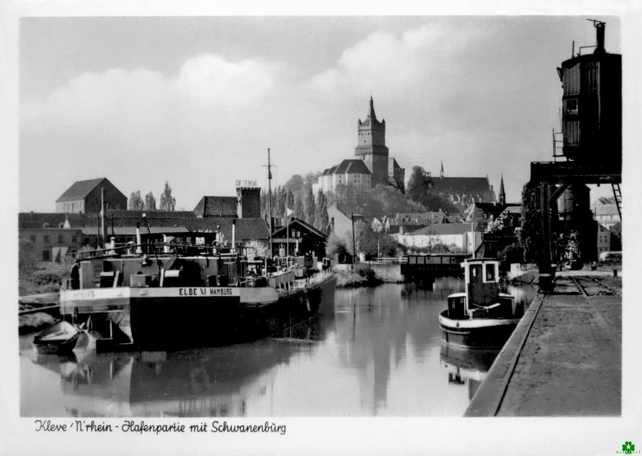 Die Elbe ist im Spoykanal gelandet Am Ufer hat das Schiff mit dem Namen „Elbe“ aus Hamburg festgemacht. Zu dieser Zeit gab es noch Handelsverkehr auf dem Spoykanal von und nach Kleve. Die Stiftskirche wartete damals noch auf ihre zwei Türme.