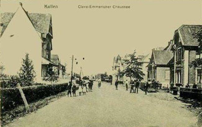 Heute eine der verkehrsreichsten Straßen in Kleve, zeigt sich die Emmericher Straße in Kellen – damals noch Chaussee – als Fußgänger-Straße. Es war um die Jahrhundertwende und Autos waren absolute Mangelware. Vereinzelt sah man ein Fahrrad oder ein Pferdefuhrwerk, aber in der Hauptsache wurde die Straße von Spaziergängern „bevölkert“. Ein Zustand, von dem die heutigen Anlieger nur träumen können.