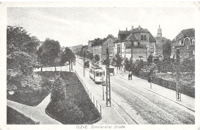 Die Straßenbahn ist soeben aus der Herzogstraße gekommen und nach links abgebogen Richtung Emmerich kurz vor der „Glück-auf-Schranke“. Wir sehen im Hintergrund das Bahnhofshotel. Das 1914 „Erstes Haus für Geschäftsreisende“ benannte Hotel war das dem Bahnhof am nächsten liegende. Rechts an der Ecke zur Herzogstraße sieht man das prachtvolle Haus des Tierarztes Max Wolff.
