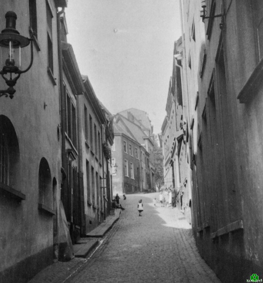 Wir schauen hier in die Stickestraße des Jahres 1934. Links eine wunderschöne Gaslaterne, von denen es damals in Kleve so einige gab. Ein steiler Weg, den man sich von unten nach oben herauf quälen musste und immer noch muss, wenn man zu Fuß unterwegs ist.