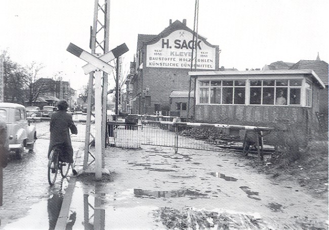 Im Gebäude rechts gingen die Schrankenwärter ihrem Job nach und kurbelten unermüdlich die Schranken hoch und runter. Dahinter unverkennbar die riesige Werbetafel der Klever Traditionsfirma Sack.