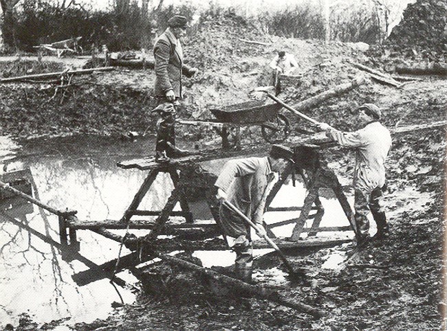 Es war nicht gerade eine komfortable Baustelle, als man im Jahre 1954 die Minerva- Statue im Amphitheater von Kleve wieder aufstellte. Wir sehen hier die Stadtleute bei ihrer unbequemen Arbeit, die aber letztendlich vom Erfolg gekrönt wurde. Ohne Minerva wäre die Anlage um eine echte Attraktion ärmer. Schön wäre es allerdings, wenn man auch eine Skulptur von Ceres wieder in ihren Tempel stellen würde. Wir haben lange genug darauf gewartet. 😉