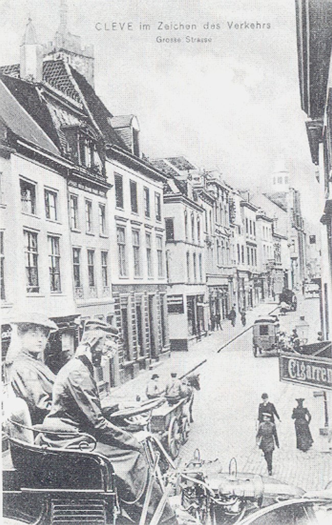 Angesichts der immer mehr auftauchenden Autos im Raume Kleve kopierte man das neuartige Fahrzeug schlichtweg in die Ansicht der Karte hinein. Allerdings sieht es so aus als würde es fliegen. Hier handelt es sich aber um die Zeit der Jahrhundertwende. 🙂