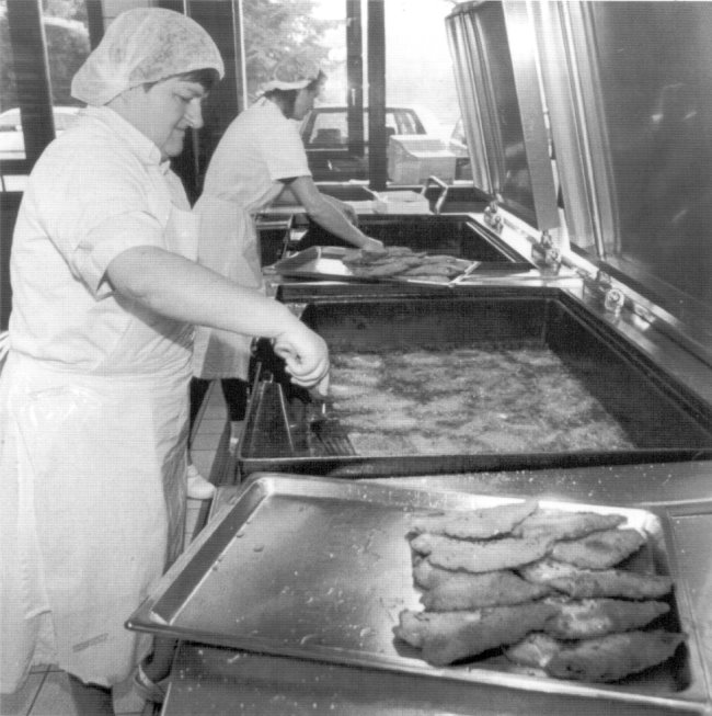 Hier sehen wir gerade die Köchinnen, die eine ordentliche Ladung Schnitzel backen. Oder handelt es sich um Fischfilets? Egal – sind heute eh verputzt. 🙂