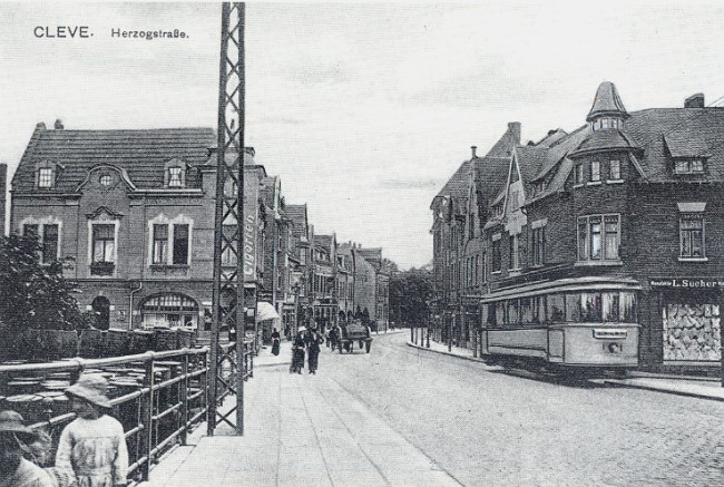 Eine wundervolle Aufnahme zu Zeiten, als die Herzogbrücke – damals noch „Neue Brücke“ gerade gebaut war. Im linken Gebäude befand sich Zigarren Pontzen und etwas weiter das Hotel-Restaurant Hohenzollern. Ganz rechts sehen wir das Bekleidungsgeschäft Sucher, in dem heute Kleve Tourismus beheimatet ist.