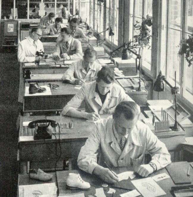 Irgendjemand muss in einem großen Produktionsunternehmen die von den Zeichnern entworfenen Modelle auch in die Tat umsetzen und zunächst Prototypen entwickeln, die sich später zur Serienreife entwickeln und in den Verkauf gelangen. Diese Menschen nannten sich bei der Klever Kinderschuhfabrik Hoffmann dann Schuh-Modelleure. Hier sehen wir einige bei ihrer verantwortungsvollen Arbeit.