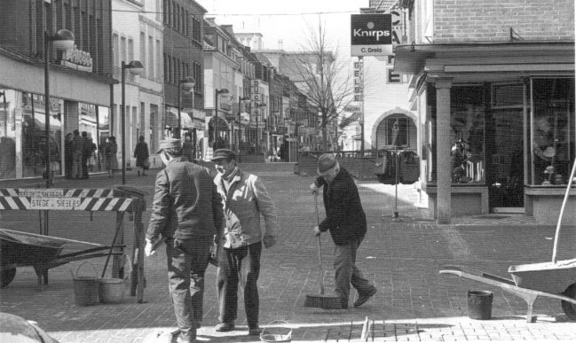 Hier sehen wir noch die letzten Arbeiten zum Umbau der Kavarinerstraße in eine Fußgängerzone. Das war im Jahre 1976 und zog auch den Bau der Großen Straße in ebenfalls eine Fußgängerzone nach sich. Zuvor hatte es heftige Diskussionen und Streitgespräche zwischen den anliegenden Geschäftsinhabern und der Stadt gegeben. Es war damals eine wegweisende und wichtige Maßnahme, die zunächst auf wenig Gegenliebe stieß.