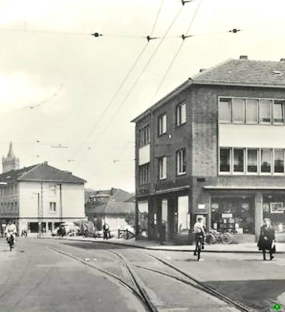 Hier sehen wir einmal genau, wie es damals auf der Hagsche Strasse ausgesehen hat, als die Straßenbahn noch in Betrieb war. Fahrradfahrer können ein Lied davon singen, wie gefährlich diese Schienen manchmal waren. Wir befinden uns hier auf Höhe der damaligen Kaufhalle und sehen noch die ehemalige Buchhandlung Feldkamp.