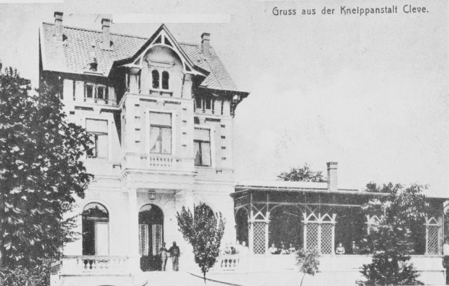 Die Kneippanstalt in Bad Cleve wurde aufgrund des Erfolges der neuzeitlichen Heilmethoden des „Wunderpfarrers“ Sebastian Kneipp Ende des 19. Jahrhunderts gegründet. Auch in der Bäderstadt Cleve war diese Institution sehr beliebt und erfolgreich. Sie war stets gut besucht, wie man an den Menschen im rechten Anbau belegt sieht.