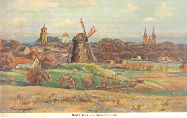 Mit diesem Blick von Materborn aus stellte der Maler dieser Ansichtskarte, die etwa um 1930 datiert, einmal nicht die ansonsten bevorzugte Schwanenburg in den Vordergrund, sondern eine große Mühle, von denen es ja zu dieser Zeit noch einige gab. Man beachte aber die eigentlich viel zu große räumliche Distanz der Stiftskirche zur Burg. Künstlerische Freiheit. 🙂
