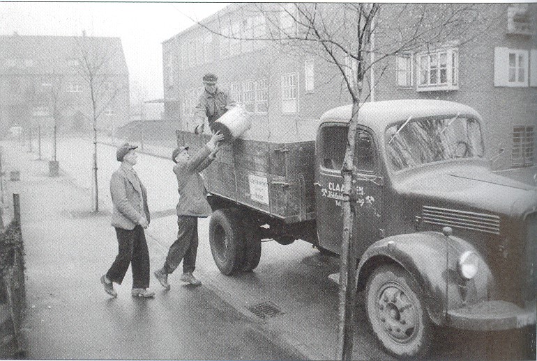 In den Fünfziger Jahren bestand die Müllabfuhr auch noch aus offenen Lastwagen, in den die Müllmänner die schweren Tonnen entleerten, wie hier in Kellen.