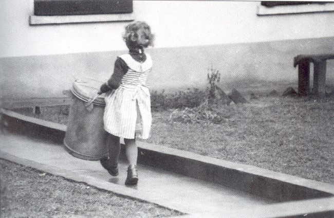 Die damaligen Mülltonnen wurden auch Ascheimer genannt, weil man damals noch die heiße Asche aus Holz-, Koks- und Kohleöfen entsorgen musste. Sie bestanden aus schwerem Zink und den kleinen Mädchen fiel es sichtlich schwer, eine solche Tonne ins Haus zu befördern.
