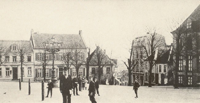 Dies ist eine Ansicht auf den Großen Markt um 1900, wo ein Fotograf noch großes Erstaunen bei der Bevölkerung auslöste. Jeder der hier zu sehenden Anwesenden blickt neugierig in die Kamera. Mitte rechts hat man einen interessanten Blick runter auf die Marktstraße.