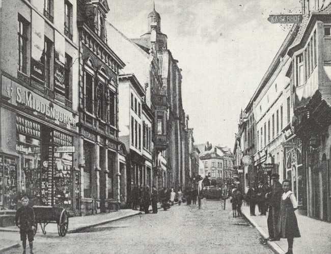 Das Bild zeigt die Große Straße in Kleve etwa um 1918 herum. Wir schauen die Straße hoch auf Höhe etwas hinter dem heutigen Kaufhof.
