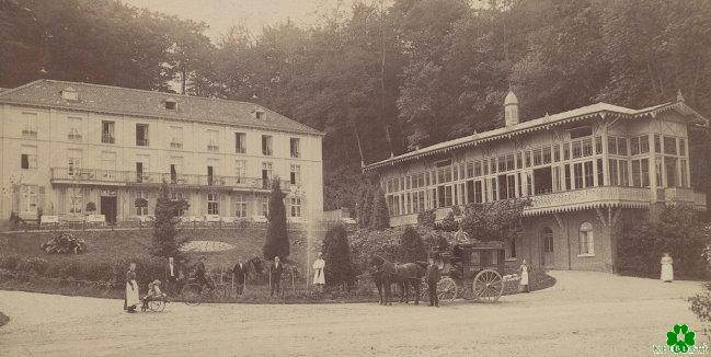 Man wird beim Anblick dieses Bildes sofort an den Wilden Westen erinnert. Nicht nur wegen des großartigen Glas-Pavillons. Die Postkutsche bzw. die Pferde-Droschke, wie es eigentlich richtig heißen müsste, gehörte tatsächlich dem Hotel Robbers. Der Schriftzug steht auf der Kutsche. Sie diente dazu, die am Bahnhof eintreffenden Kur- und Hotelgäste von dort abzuholen. Ein Service, den man heute immer noch von zahlreichen guten Hotels schätzt. Nunmehr heißt das dann „Privat-Transfer“. 😉