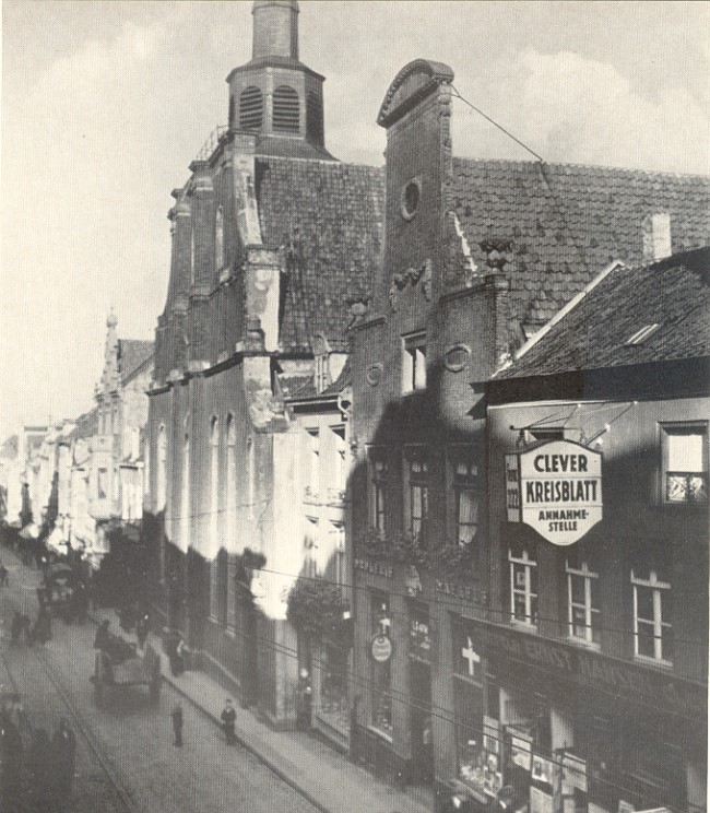 Die reformierte Kirche auf der Großen Straße befand sich dort zu Zeiten, als die Straße noch sehr schmal war und gerade ein Pferdefuhrwerk bequem hindurch fahren konnte wie man sieht. Rechts daneben sieht man noch das Haus Naegele und die Annahmestelle des Clever Kreisblattes. Lang ist’s her.