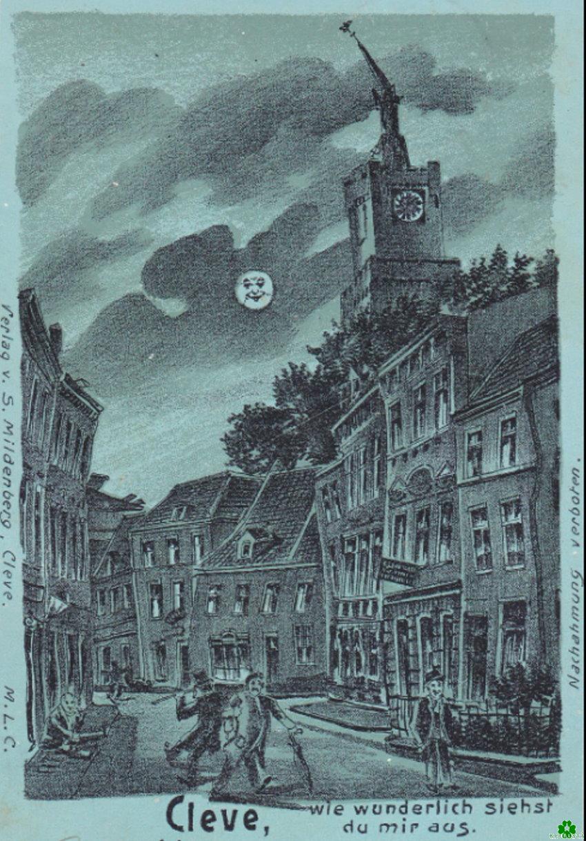 In der Tat sieht das Ganze hier auf dem Bild sehr wunderlich aus. Die Karte aus dem Verlag von Sally Mildenberg sollte wohl die Sicht eines Betrunkenen suggerieren. Interessant die Bemerkung am rechten Bildrand „Nachahmung verboten“. Tatsächlich?