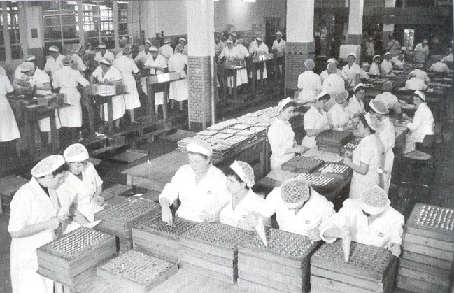 Hier sieht man die in hygienischem Weiß gekleideten Damen wie emsige Bienen die Schokolade fachgerecht in Formen zu füllen, zu drapieren und zu verpacken. Man sollte sich dieses Bild gut anschauen, denn heutzutage erledigt das eine einzige Maschine – nur in wesentlich größeren Mengen bei gleichem Zeitaufwand. Das Ganze nennt man dann Fortschritt. Schade. 😉
