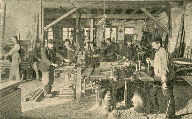 Hier schauen wir in das Innere des Maschinensaals der Niederrheinischen Schulbankfabrik von Heinrich Hübecker im damaligen Cleve. Wir sehen zahlreiche Schreiner an ihren Werkbänken, die mit Sägen und Hobeln kiloweise Sägemehl produzierten, wie man unten auf dem Bild erkennen kann. Aber es kamen wohl auch qualitativ gut gearbeitete Schulbänke dabei heraus. Wer weiß an wie vielen davon tausende von Schülern im Unterricht gesessen haben und wohlmöglich sogar einige Buchstaben und Zeichen darin geschnitzt haben? 😉