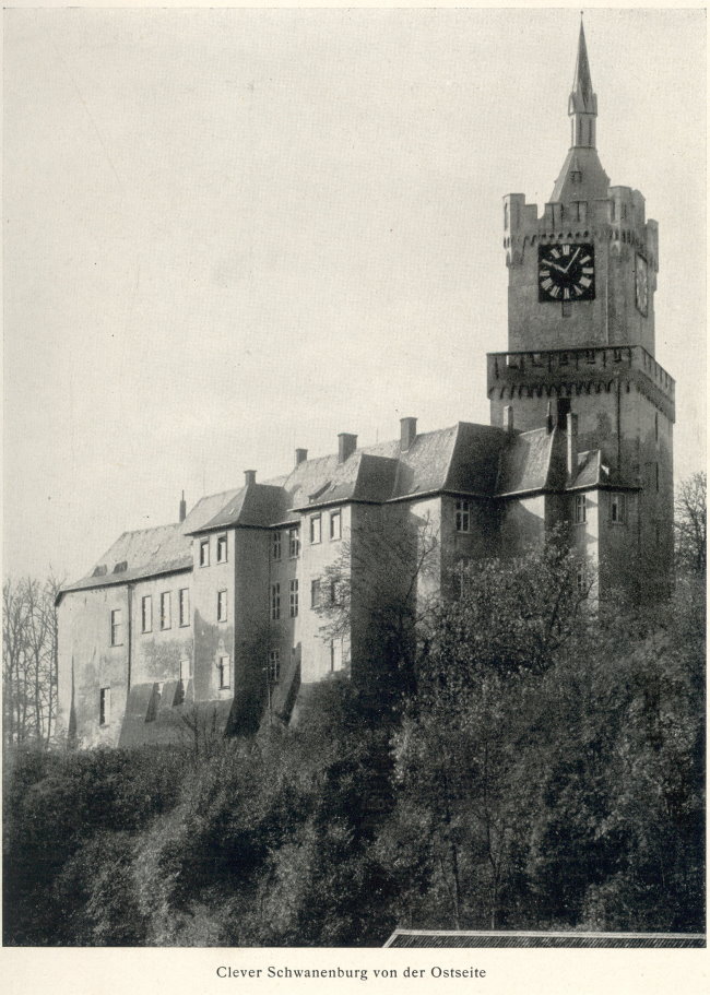 Bevor die Schwanenburg im zweiten Weltkrieg ziemlich zerstört wurde, zeigte sie sich – wie hier von der Ostseite – in ihrer ganzen Wucht, Pracht und Schönheit. Markant war damals die große Uhr mit dem schwarzen Zifferblatt. Ein herrlicher Anblick Klever Geschichte.