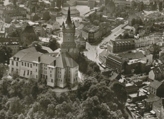 Man könnte beim Anblick dieses Bildes tatsächlich den Eindruck gewinnen, als ob der Turm der Schwanenburg den Betrachter staunend anschaut. Rechts davon bietet sich noch ein herrlicher Blick auf den Fischmarkt, Große Straße, Cafe‘ Schürings und Stechbahn.