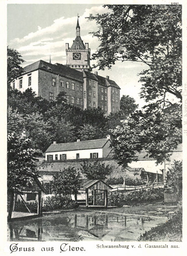 Als es an der Stelle, wo später die Klever Badeanstalt und danach das Hallenbad entstanden, befand sich zunächst die Klever Gasanstalt. Daher steht auch noch auf der Karte der Blickwinkel, von dem aus man hier die Schwanenburg betrachtet. Ein absolut sehenswertes Panorama.