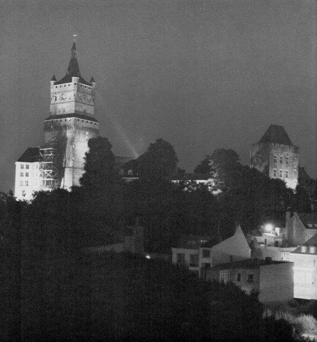 Im Lichtkegel der Scheinwerfer sehen wir hier Ende der Fünfziger Jahre noch ein Baugerüst an der Schwanenburg in Kleve, nachdem erst kürzlich monatelang ebenfalls eingerüstet war.