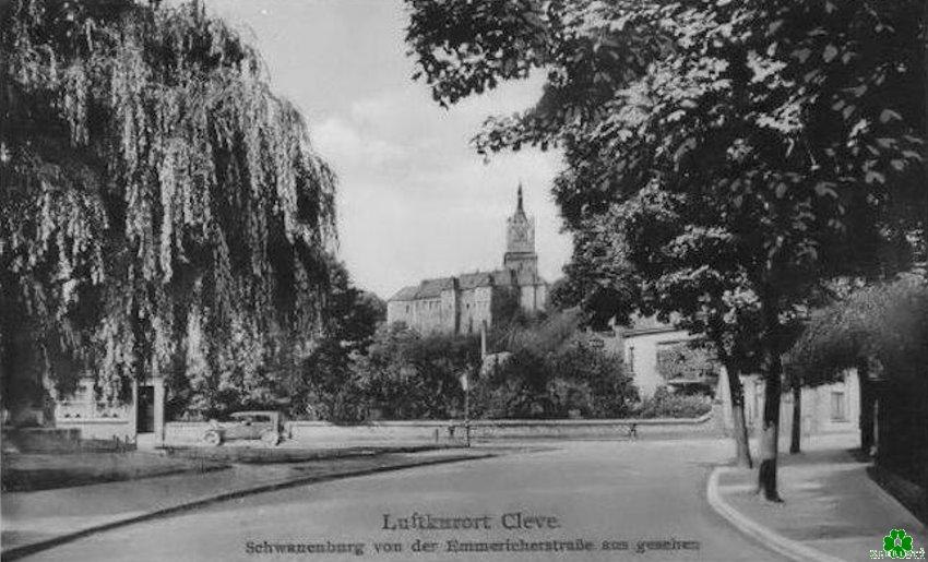 Links hinten sehen wir einen tollen Oldtimer fahren. Das ist Beleg dafür, wie lange diese Aufnahme her ist. Wer kann erklären, wo wir uns hier befinden. Die Aussage auf der Ansichtskarte sagt Blick auf die Schwanenburg von der Emmericher Straße aus gesehen. Richtig?