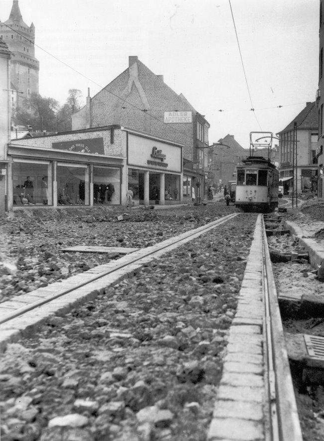 Zu sehen ist aber die damals schon wieder fahrende Straßenbahn – die „Elektrische“. Man sieht links das Bekleidungshaus „Hettlage“ und dahinter die Adler-Apotheke.
