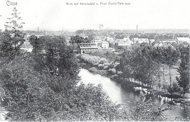 Unten der Spiegel des Kermisdahl, mittig darüber mit den vier Kaminen die alte Gasanstalt am Königsgarten, die 1908 abgerissen wurde für den Neubau des Stadtbades. Die sich damals bereits abzeichnende aufstrebende Industrialisierung Kleves lässt sich an den zahlreichen qualmenden Kaminen im Hintergrund feststellen.