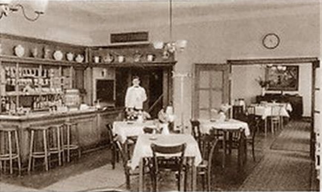 So sah es seinerzeit im Hotel-Restaurant König von Preußen in Kleve aus. Links die für die damalige Zeit typische Theke mit einigen Barhockern und dem zeitgemäßen Interieur. Der Kellner steht in hoffnungsvoller Pose und erwartet die ersten Gäste. Oder hatte man ihn nur für das Foto dort hin gestellt?