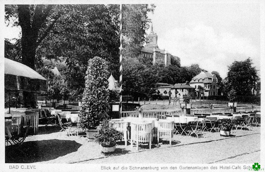 Diese Ansichtskarte aus den dreissiger Jahren verdeutlicht schon, wie romantisch es damals am Ufer des Kermisdahl aussah. Man lieh sich einen Holznachen und ruderte seine Liebste über das stille Wasser. Danach genoss man die Aussicht auf die Schwanenburg und ließ es sich bei Kaffee und Kuchen gutgehen.