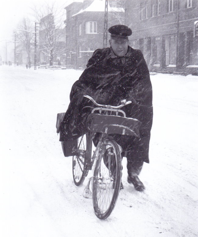 Hier sehen wir einen Briefträger, der im Schneesturm auf der Emmericher Straße seinen Zustellbezirk hatte.