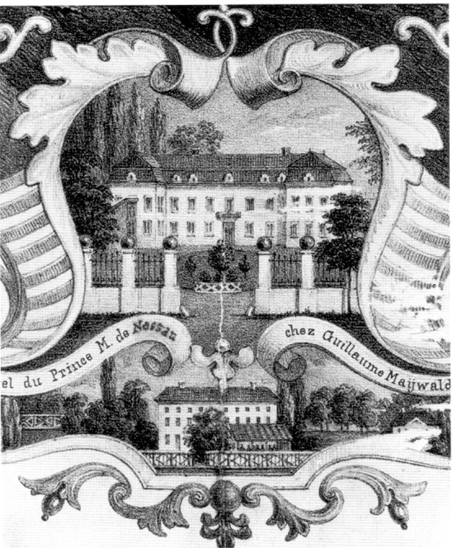 Wir sehen hier die Vorder- und die Rückseite des damaligen ersten Hauses am Platze um 1843 auf einer Lithographie von J.C.W.Jelle‘, der etwa um 1840-50 in Kleve tätig war.