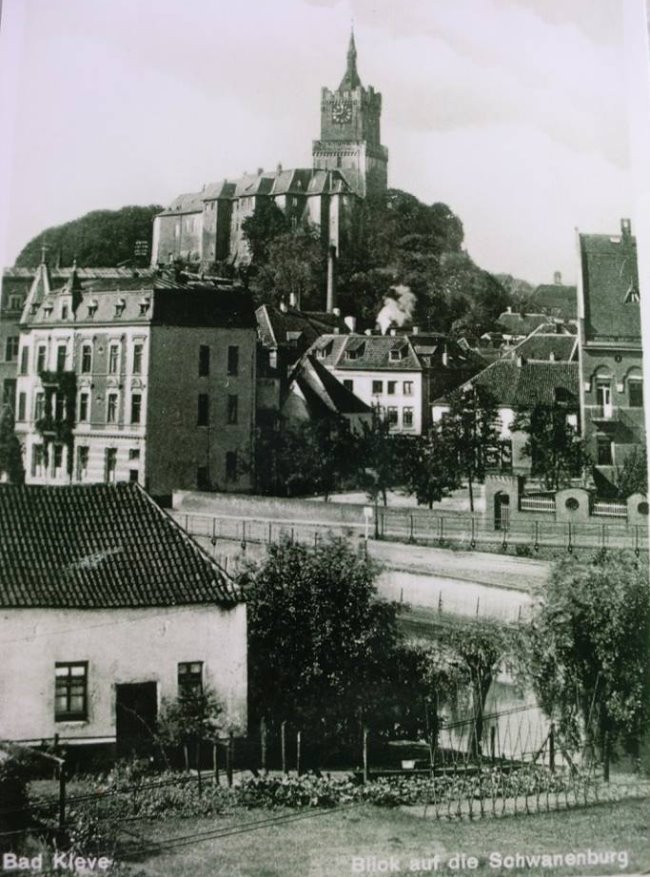 Mit dem Blick auf die Schwanenburg sehen wir im Vordergrund einen Garten, so wie man ihn damals gestaltete. Die Gesamtansicht ist den meisten Klevern wohl nicht mehr so geläufig, hatte aber auch einen eigenen Charme. Es war zu der Zeit, als Kleve immer noch Bäderstadt war, sich jedoch schon mit „K“ schrieb anstatt wie zuvor mit „C“.