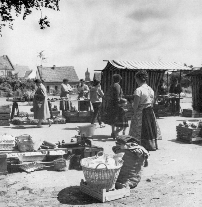 Hier sehen wir einen Klever Markt Ende der Fünfziger Jahre. Die Stände sind noch ganz einfach gebaut und das Gemüse, die Eier und die Kartoffeln kamen noch vom eigenen Hof und nicht aus Übersee oder Afrika. Im Vordergrund erkennt man noch die alten Waagen, die mit Konter-Gewichtssteinen funktionierten. Die Marktfrauen trugen noch die langen Kleider, Röcke und Kittelschürzen.