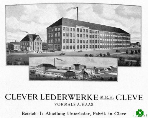 Etlichen Klever:innen dürfte das Gebäude bekannt vorkommen, hat es doch schon etliche Firmen in der Zeit beheimatet. Abraham Haas war 1863 mit seiner Ehefrau Sophie als Lohn-Tiergerber nach Kleve gekommen und betrieb später eine Gerberei am Opschlag. 1910 konnte die Firma, die nun den Namen „Clever Lederwerke mbH Cleve vormals A. Haas“ hatte, in ein modernes Fabrikgebäude an der Briener Straße umziehen. Rohstoffe für das Werk wurden über den Klever Hafen angeliefert.