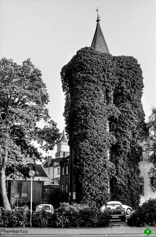 Es sah in den 70ern tatsächlich so aus, als hätte man dem Turm einen dicken Pulli übergestreift. Der Eindruck wurde erreicht durch den dichten Efeubewuchs, den das Mauerwerk zu erleiden hatte. Sah zwar interessant aus, war aber nicht wirklich sinnvoll. Unten erkennt man noch den alten davor gelagerten Parkplatz, wo sich aktuell die Kaskade befindet.