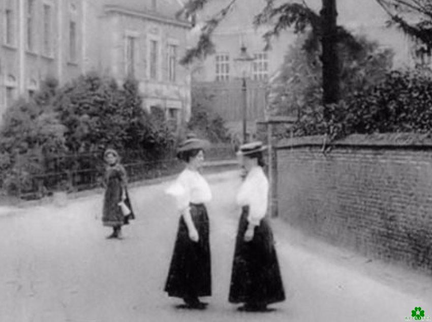 Das wäre heutzutage so nicht mehr möglich. Aber zu der Zeit, wo dieses Foto aufgenommen wurde, gab es noch keinen hektischen Straßenverkehr mit Motorfahrzeugen. Also quatschte man in aller Ruhe mitten auf der Straße.