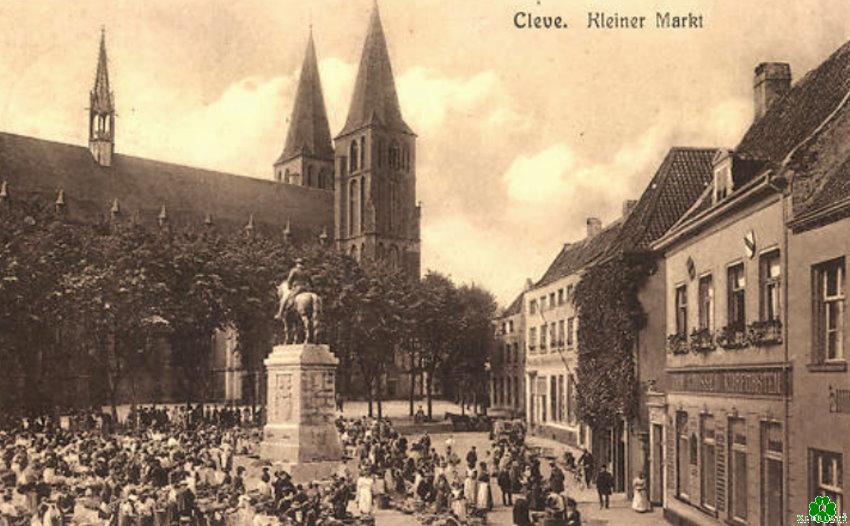 Ein Markttag auf dem Kleinen Markt Man sieht kaum die Körbe und Kisten, in denen die Marktleute damals ihre Waren anpriesen. So voll war es derzeit am Markttag auf dem Kleine Markt in Cleve.