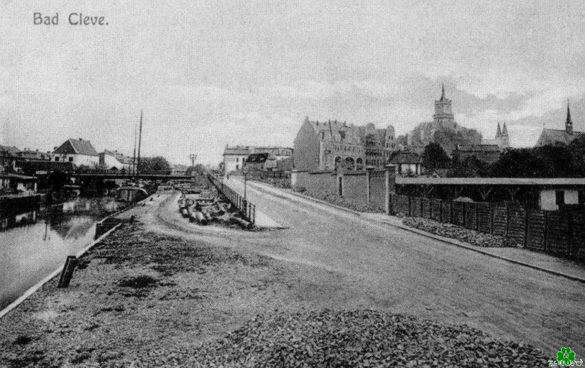 Hier sehen wir die Werfstrasse in der Nähe des Hafens im Jahre 1906. Rechts befand sich damals dort noch eine große Kohlenhandlung. Mittig erkennt man einige dort gelagerte Baumstämme, die mit den Lastschiffen derzeit nach Kleve gebracht wurden.