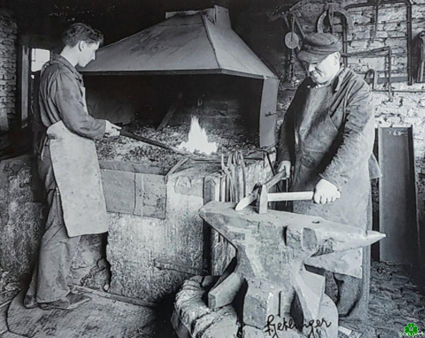 Es scheint tatsächlich auch ein Schwert zu sein, welches der Schmied gerade versucht, in Form zu bringen. Wir schauen hier ins Innere der alten Schmiede Schmitz auf der Kermisdahlstrasse. Die Einrichtung, die Werkzeuge, der Amboss und der Ofen scheint man aus dem Mittelalter übernommen zu haben. Auch kannte man derzeit wohl keine Sicherheitsschuhe. Man stand noch mit Strasseschuhen und Pantoffeln an der Feuerstelle.