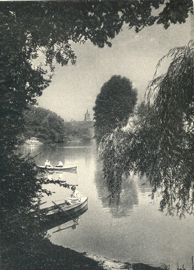 Früher konnte man wohl nie genug bekommen von Boots-Ausflügen auf dem Kermisdahl. Nun – die Aussichten waren auch wirklich schöner als heute, denn man sah vom Wasser aus das Hotel Maywald und viele andere, heute nicht mehr existierende Gebäude. Hier scheint eine junge Dame auf Herrenbesuch zu warten, denn sie sitzt ganz träumerisch in ihrem Nachen. Allerdings in dieser Zeit kaum vorstellbar, das sie alleine gerudert ist. Ihr Angebeteter ist vermutlich vom Laub der Bäume verdeckt. 🙂