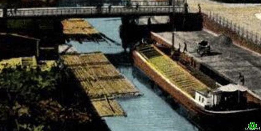 Flößerei auf dem Spoykanal Etliche Holzstämme versperren den halben Spoykanal. Sie sind wie ein Floß gebunden und auf dem Schiff befindet sich wohl schon Nachschub. Gedacht war das ganze Holz vermutlich für den Betrieb von Dorsemagen.