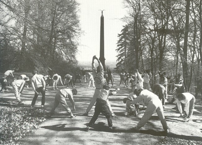 Fast hat es den Anschein, als würde hier – ähnlich wie in China – gesunder Frühsport betrieben. Der Wahrheit näher kommt es indes, das es sich um eine Gruppe handelt, die sich der damaligen „Trimm-Dich“-Bewegung zugehörig fühlte.